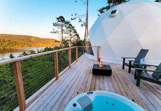 Het platform van de Dome is voorzien van een luxe hottub, 2 Muskoka stoelen en een vuurplaats. Ook is er een buitendouche met warm- en koud water. Het platform is tevens voorzien van sfeerlichtjes. Een heerlijke plek om te zitten en te genieten van het uitzicht na een dag vol avontuur.
