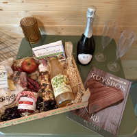 We verblijven in Het Boshuys, een knusse, luxe accommodatie met een eigen hottub. Marlies en Anton geven ons een korte rondleiding en verrassen ons met een rijk gevuld streekpakket. Appel-perensap, kersen, en zelfs een flesje Ruybos-Prosecco: Buitengoed Ruysbos weet wat verwennen is.