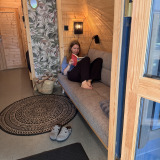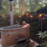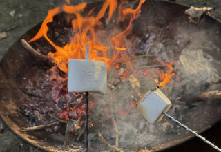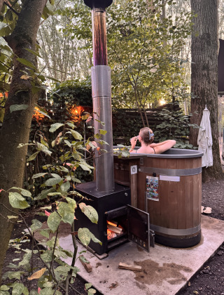 Na het eten is het tijd voor ontspanning. We hakken nog wat hout, verzamelen een paar takken uit het bos voor ons kampvuur, en nemen plaats in de warme hottub. Prosecco in de ene hand, lokale chips in de andere. Dit is glamping op z’n best. Na een lange avond ontspannen kruipen we met marshmallows en een boekje bij het vuur, en daarna hup het bed in.