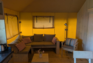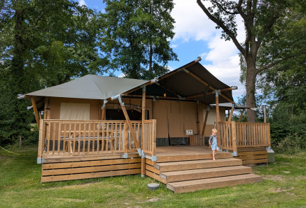 Het type safaritent zelf is één van mijn favorieten. Je kunt het tentzeil in het midden oprollen, waardoor er een soort buitenbar ontstaat. Terwijl je kookt (met uitzicht op het veldje – ideaal met kinderen), borrelt je reisgezelschap alvast aan het barretje. Praktisch én gezellig.