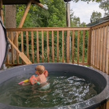 We slapen in een 6-persoons Medley Lodge met ingebouwde hottub. Ja, je leest het goed: ingebouwd. Waar je normaal naast de tent in het warme water plonst, zit deze hier in het terras ingebouwd. Volgens de eigenaar was dit een bewuste keuze – eentje die prima is uitgepakt naar mijn mening.