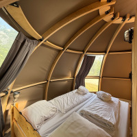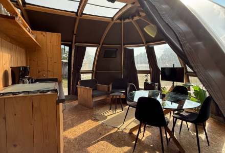 Tijd om onze accommodatie goed te bekijken. De Riverdome is ruim, sfeervol en van alle gemakken voorzien, met een fijne woonkamer, een goed uitgeruste keuken met grote koelkast en vaatwasser, een badkamer met regendouche en een knus slaapgedeelte voor twee volwassenen en twee kinderen. Bij aankomst stond er een keukenpakket voor ons klaar, inclusief lucifers en aanmaakblokjes voor de hottub.De tent wordt ondersteund door een robuust houten frame, wat zorgt voor een knusse, stijlvolle sfeer. Via het overdekte terras met picknicktafel kijk je uit over het glampingveld, waar ook accommodaties staan zoals de Panorama Lodge, Blij in de Wei-tent en Dream Suite.