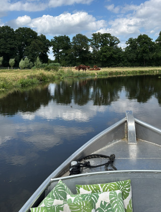 Hoewel we allebei onervaren waren, hadden we meteen het gevoel: dit gaat lukken. Na een korte instructie konden we op pad. Na de eerste bocht bevonden we ons direct in de rust van de natuur: eenden, libellen, vlinders en grazende koeien. Het liet ons weer even beseffen hoe mooi Nederlans is! Na zo’n anderhalf uur varen keerden we terug, precies op tijd om de sloep in te leveren.