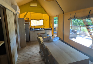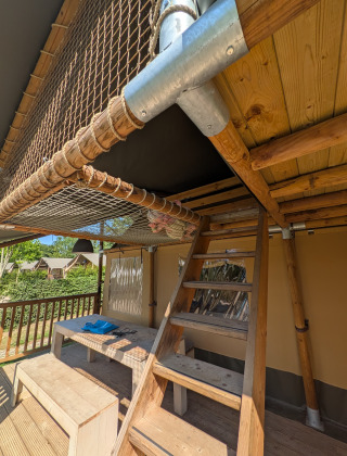 De tent is tot in de puntjes verzorgd. Er staat een BBQ voor de deur, een hangmat bungelt uitnodigend tussen twee palen en binnen is het luxe ten top: een Nespresso-apparaat, regendouche, vaatwasser, comfortabele bedden en een afsluitbare deur zodat je spullen veilig liggen. Maar wat echt indruk maakte? Het speelnet en de ‘geheime hut’ bovenin de tent – volgens mijn zoontje van drie dé highlight van de vakantie.