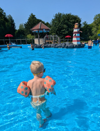 Foto van het zwembad is genomen bij het buitenzwembad in Meerssen, op 5 min rijden van de camping.