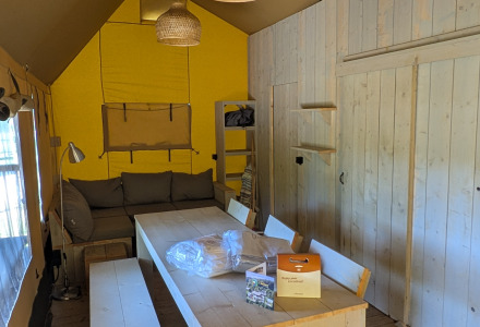 We kwamen aan op een tropische dag – dik 30 graden – maar bij binnenkomst in de tent was het gelukkig aangenaam koel. De airco stond al aan. Dát is pas glamping. Wat direct opviel? Alles klopt. Van de goedgevulde keukenkit en het leuke verrassingspakket dat voor ons klaarstond, tot het extra schaduwdoek dat klaarlag om zo meer schaduwplekken te kunnen creëren.