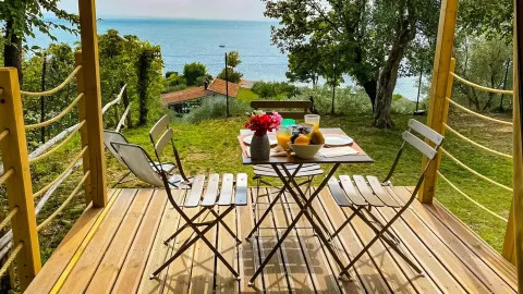 Vacanze Glamping Boutique voelt als een kleine, groene oase aan het Gardameer. Je verblijft hier in stijlvolle glampingaccommodaties, van bijzondere lodges zoals de Air Dreamer en Air Lodge tot compleet ingerichte cottages met het comfort van thuis. Overdag is er volop vakantieplezier met waterpret in het buitenzwembad met glijbaan. Voor eten en drinken schuif je aan bij het restaurant en de pizzeria, of haal je iets lekkers in de minimarkt. Kinderen vermaken zich met animatie in de Spotty’s Kids club. In de omgeving kun je goed hiken of ga lekker het water op met een kajak of SUP.