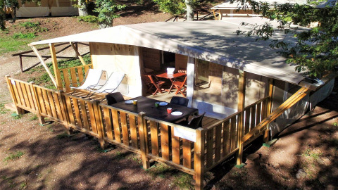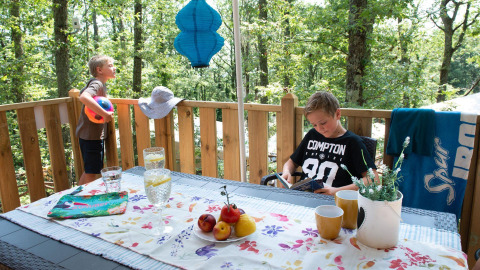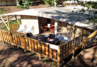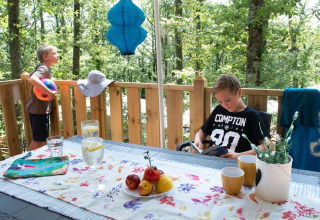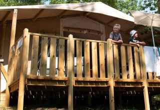 De Lodge Tent Deluxe biedt veel comfort en sfeer, ideaal voor een ontspannen familievakantie. Met twee gezellige slaapkamers, één met een tweepersoonsbed en één met een eenpersoonsbed en een stapelbed, heeft iedereen zijn eigen plekje om heerlijk te slapen. De moderne badkamer met douche, toilet en wastafel zorgt voor extra gemak en privacy. Er is een ruime woonkamer en een volledig ingerichte keuken, perfect voor het bereiden van heerlijke maaltijden. Buiten op het grote terras staat een complete set tuinmeubilair, waar je kunt ontbijten in de ochtend of samen spelletjes speelt in de avond. Hoewel er geen airconditioning is, zorgt de natuurlijke omgeving voor een heerlijk vakantiegevoel.