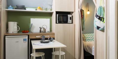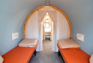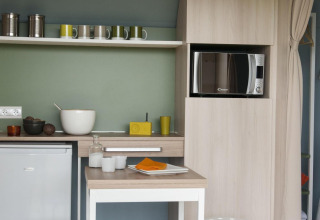 Binnen zijn twee slaapgedeeltes, waarvan één met comfortabel tweepersoonsbed, en één met twee eenpersoonsbedden. Er is een praktische, goed uitgeruste kitchenette met inductiekookplaat voor smakelijke maaltijden.
