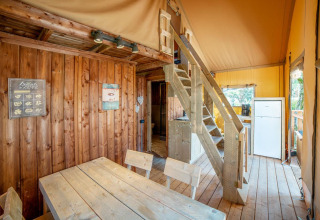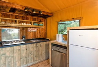 Begin de dag met een ontbijt in de frisse ochtendzon, speel spelletjes in de schaduw en eindig met een gezellig diner onder een fonkelende sterrenhemel. Binnen gaat het avontuur verder! De Safari Lodge is stoer en modern ingericht, met robuust hout en stevig tentdoek die zorgen voor een warme, avontuurlijke sfeer. Op de begane grond vind je een gezellige, romantische ouderslaapkamer en een ruime badkamer met alles wat je nodig hebt. De woonkamer en keuken ademen pure Glamping, ruig, sfeervol en van alle gemakken voorzien.
