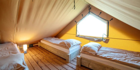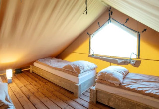 En dan de bovenverdieping... een eigen speel- en slaapparadijs voor de kids, met drie eenpersoonsbedden waar ze kunnen dromen over de avonturen van de dag. Geen airco of verwarming? Niet nodig! Hier draait alles om puur natuur en het echte Glampinggevoel.