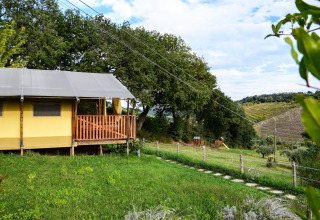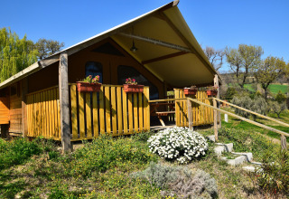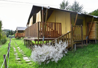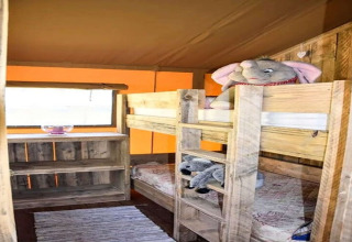 Binnen vind je twee knusse slaapkamers en een moderne badkamer met een ontspannende hydromassage-douche. Na een zonnige dag zorgt de airconditioning ervoor dat de tent heerlijk koel blijft, zelfs op de heetste zomerdagen. Buiten nodigt een ruim, overdekt terras met tafel, stoelen en een comfortabele bank uit om lekker lang buiten te tafelen of ontspannen met een goed boek. Het is een heerlijke plek voor kinderen om dichtbij te spelen terwijl jij tot rust komt.