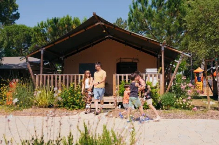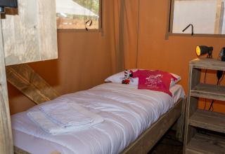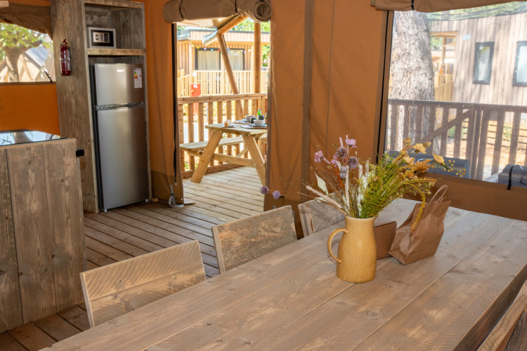 Deze ruime Glamping-tent is gemaakt van hout en canvas en heeft een stoere en robuuste uitstraling die perfect in de natuurlijke omgeving past. Binnen zijn twee slaapkamers, waarvan een met een tweepersoonsbed en een met een stapelbed voor de kinderen. De tent is uitgerust met een volledig ingerichte keuken, een eethoek en een picknicktafel op het terras voor lange, gezellige avonden. De moderne badkamer zorgt voor extra comfort. Hoewel er geen airconditioning of verwarming is, kun je hier in elk seizoen genieten van het ultieme buitenleven.