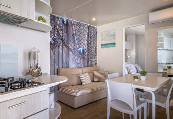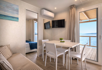 • Luchtfoto van Premium Holiday Home cabins bij Aminess Planet Camping Sirena in Kroatië, aan zee.