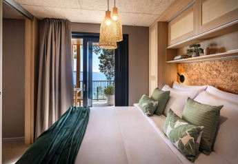 • Buitenterras van Valamar Camping Padova met uitzicht op strand en parasols in Primorje-Gorski Kotar.