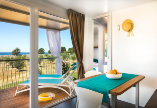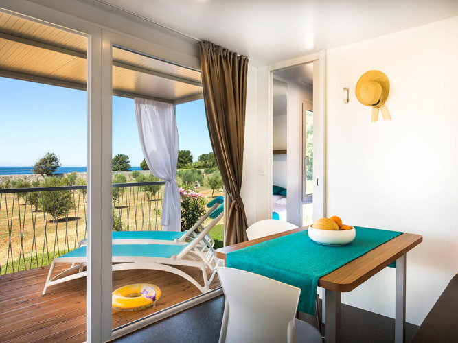 Op slechts een paar stappen van het strand (70 meter) vind je je glamping-accommodatie met een ruime overdekte veranda voorzien van ligstoelen en een eettafel, zodat je heerlijk kunt ontspannen met een prachtig uitzicht op de olijfgaarden en de schitterende Adriatische Zee. De woning is 32 m² groot en beschikt over twee slaapkamers (één met een tweepersoonsbed en één met twee eenpersoonsbedden), een zonnige woonkamer met een bank die ruimte biedt aan nog twee slaapplaatsen, en twee badkamers met douches.
