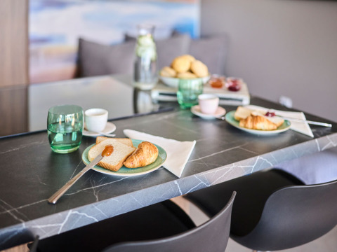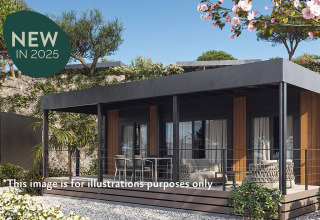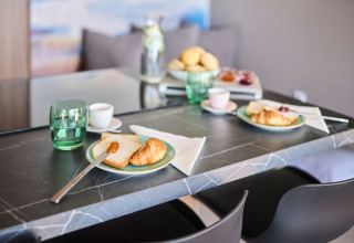 Stap binnen in deze prachtig ontworpen vakantiewoning, met 41m² elegant interieur dat naadloos overgaat in een ruim privéterras. Grote glazen deuren laten veel natuurlijk licht binnen, waardoor er een heldere, uitnodigende leefruimte ontstaat. De open keuken is uitgerust met moderne apparatuur, waaronder een vaatwasser, magnetron, waterkoker en een stijlvolle Nespresso koffiemachine, perfect voor een ontspannen ontbijt aan het chique marmeren kookeiland of voor een relaxte middag met uitzicht.
