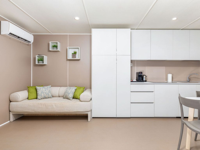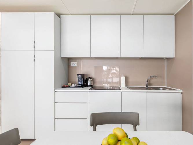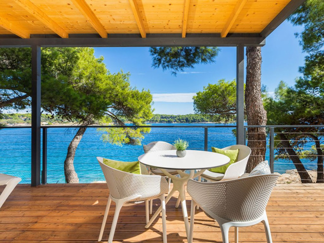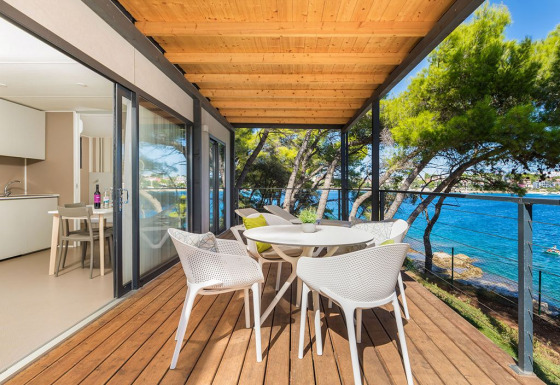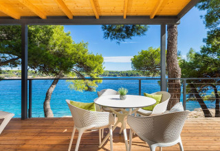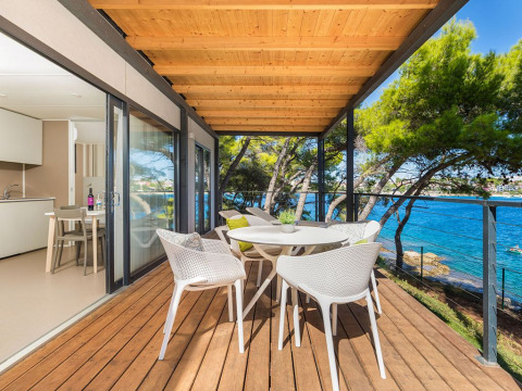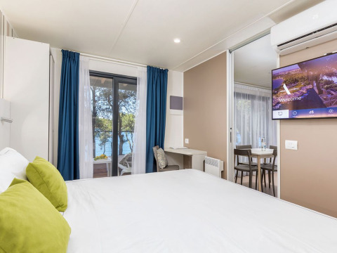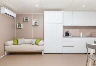 Camping Villa First Row is een accommodatie van 46 m² met een extra terras van 29 m², ontworpen voor maximaal 6 gasten, gelegen in de eerste rij aan zee. De accommodatie beschikt over airconditioning en gratis wifi. De woonkamer heeft een slaapbank (80x185 cm) en een volledig uitgeruste kitchenette met een grote koelkast met vriesvak, een vaatwasser, inductiekookplaat, magnetron, waterkoker en een ILLY espressomachine.