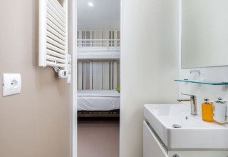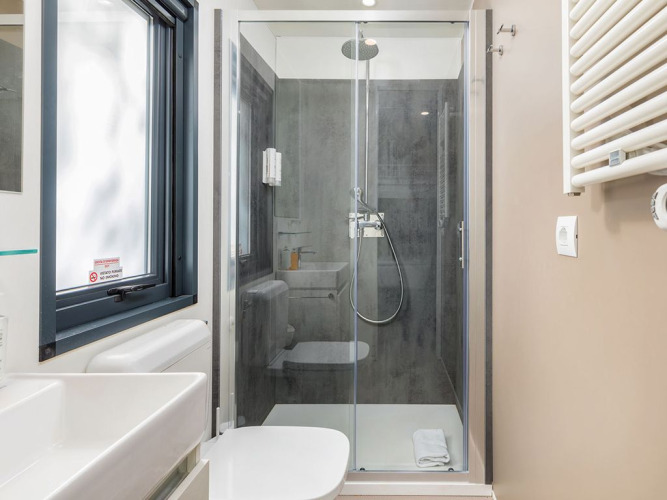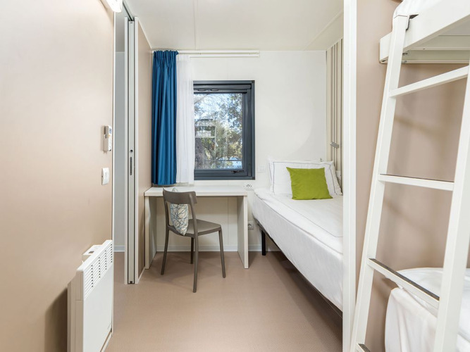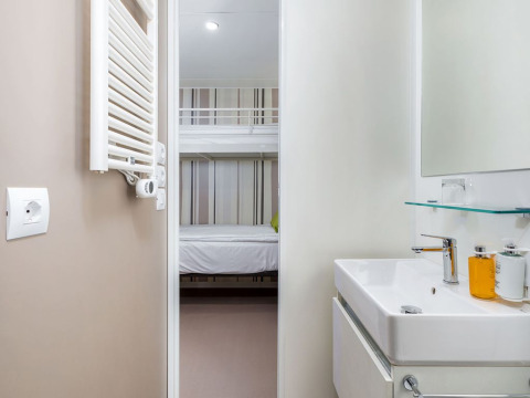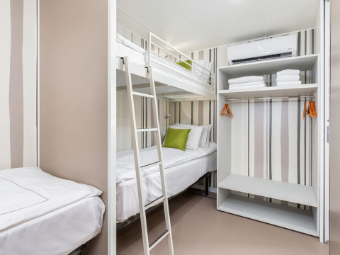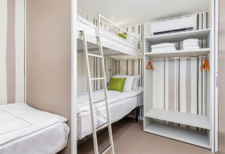 De hoofdslaapkamer heeft een tweepersoonsbed (180x200 cm) en een eigen badkamer met douche, föhn en toiletartikelen. De tweede slaapkamer beschikt over een stapelbed en een hoogslaper (allemaal 80x200 cm) met een eigen badkamer. Er zijn twee smart-tv’s van 43 inch aanwezig (één in de hoofdslaapkamer, één in het woongedeelte), beide geschikt voor IPTV.