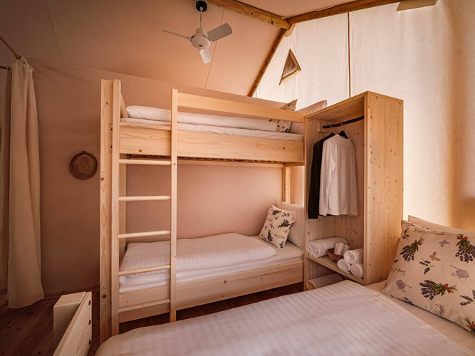 De Sunset Premium Glamping Tent biedt 35 m² aan stijlvolle comfort in het rustige Sunset Glamping Village, met een spectaculair uitzicht op de zonsondergang. De tent is geschikt voor maximaal zes personen en combineert de charme van kamperen met moderne luxe. Er zijn twee slaapkamers – één met een tweepersoonsbed en één met een eenpersoonsbed plus een stapelbed – en een woonkamer met een slaapbank en satelliet-tv. De volledig uitgeruste keuken bevat alles wat je nodig hebt om gemakkelijk te koken, en de privébadkamer zorgt voor extra comfort. Airconditioning garandeert een aangenaam verblijf in alle seizoenen. Buiten nodigt een ruim overdekt terras met houten meubilair uit om te ontspannen. Huisdieren zijn welkom. Geniet van extra gemak met VALFRESCO Direkt, dat lokale boodschappen en vers bereide maaltijden direct bij je tent bezorgt.