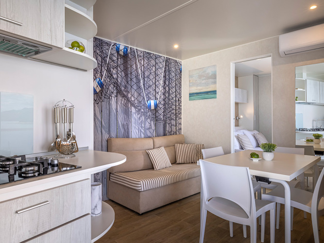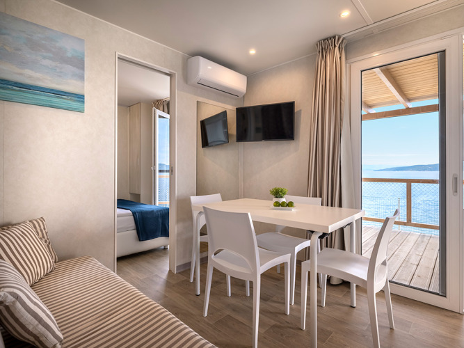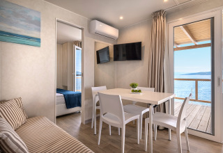 Geniet van een onvergetelijke glampingvakantie in de Marina Home voor 4+2 op Valamar Camping Marina. Gelegen direct aan de schitterende Adriatische Zee, biedt deze prachtig ontworpen stacaravan comfort, stijl en een panoramisch uitzicht op zee vanaf het ruime terras.