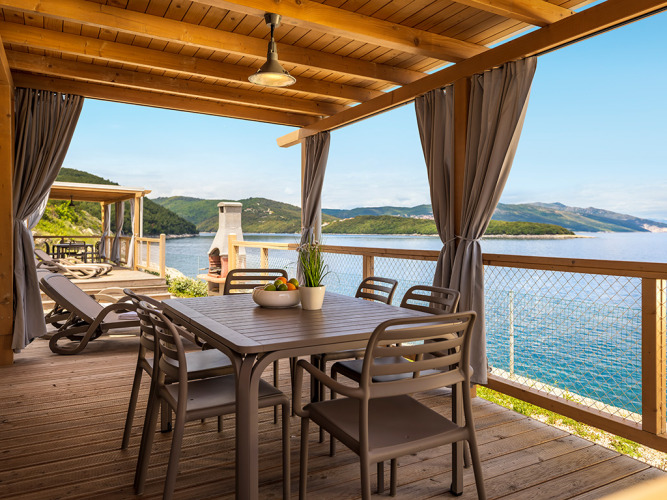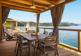 Het hoogtepunt van de Marina Home is zonder twijfel het royaal bemeten terras, met een schaduwrijke eethoek en loungebedden — perfect om tot rust te komen met een boek of om samen te eten tegen de achtergrond van het schitterende blauwe water. Met de kristalheldere zee op slechts 50 meter afstand is een verfrissende duik altijd dichtbij. De privacygordijnen en de natuurlijke houten constructie van het terras zorgen voor een rustige sfeer, zodat u optimaal kunt genieten van het leven aan zee.