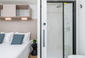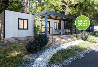 • Camping Arena Grand Kažela in Istrië, Kroatië, met moderne huisjes, een lang zwembad en uitzicht op zee.