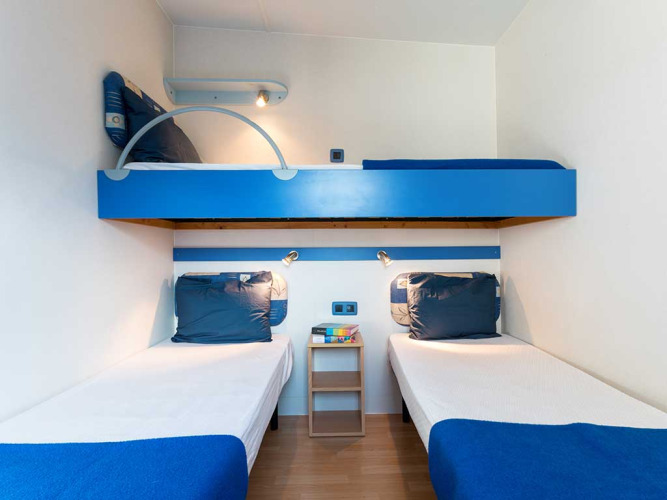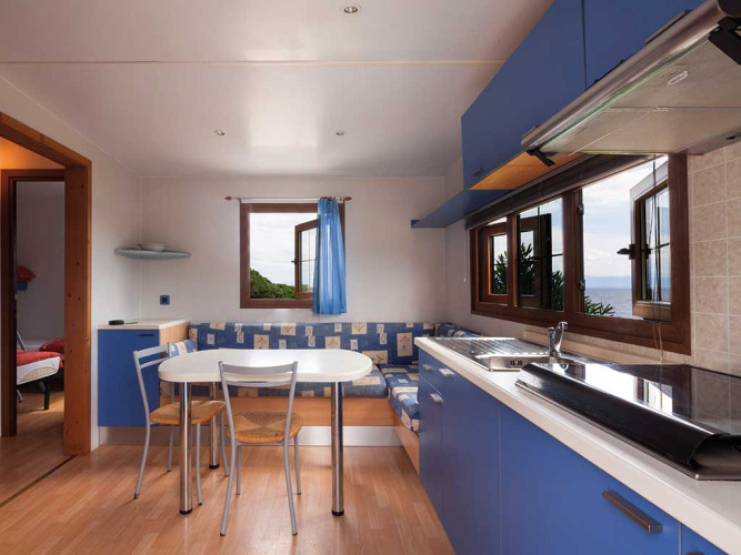 Het heeft een oppervlakte van ongeveer 31 m² en biedt plaats aan maximaal 4 personen. Het bestaat uit een woonkamer met een tafel, stoelen en een slaapbank, een kitchenette voorzien van een hoge koelkast met vriesvak, een 4-pits gaskookplaat, een gootsteen, potten en pannen en servies. Het slaapgedeelte bestaat uit 2 slaapkamers, één met een tweepersoonsbed en een ruime slaapkamer met 2 eenpersoonsbedden (deze kunnen aan elkaar geschoven worden) en een derde verhoogd bed. De accommodatie beschikt over 1 ruime badkamer, compleet met wc, douche, bidet en wastafel. Buiten is er een overdekt houten terras met een tafel en stoelen waar je kunt ontspannen en genieten van je vakantie in de buitenlucht.