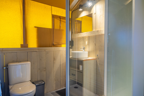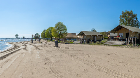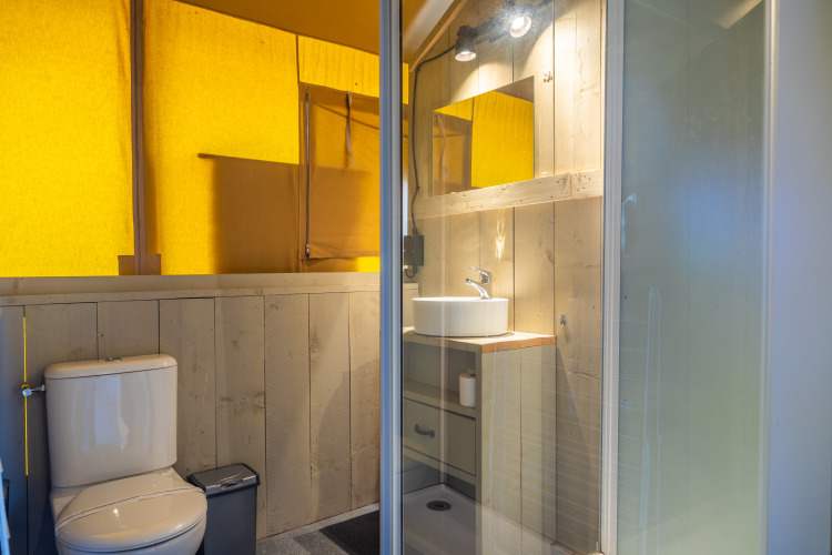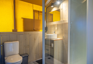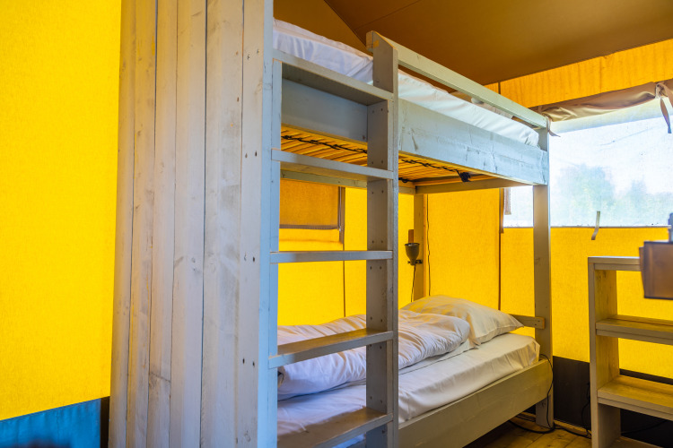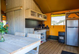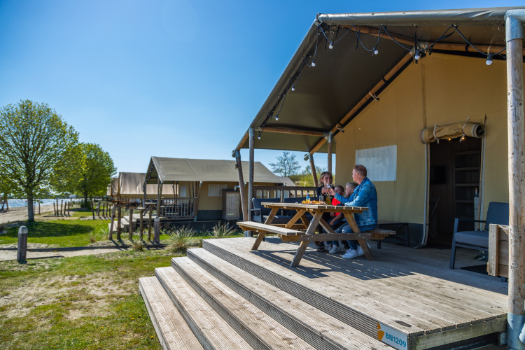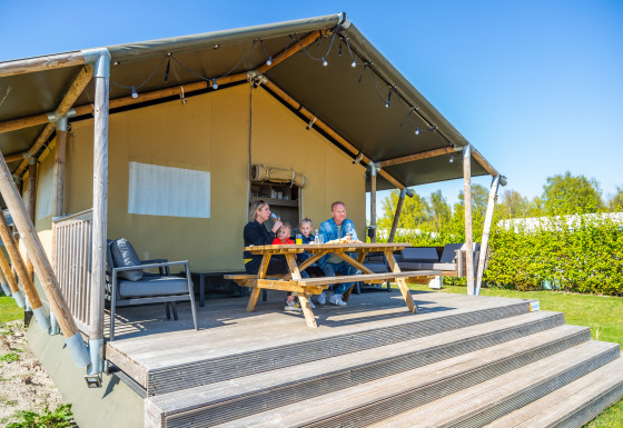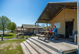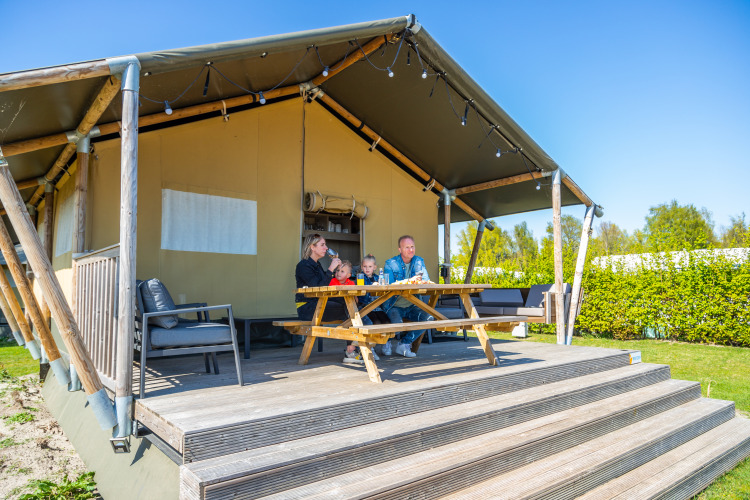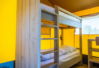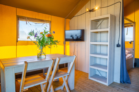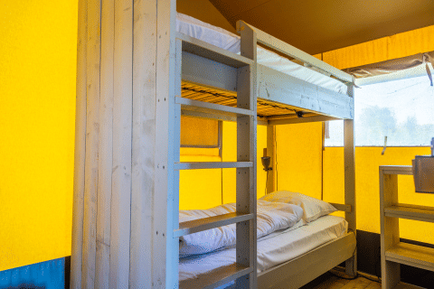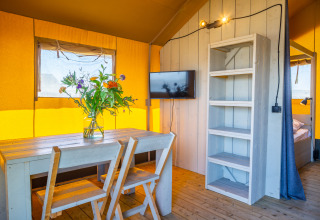 Geniet van een zorgeloze vakantie in de Lodgetent 4, waar het buitenleven samenkomt met het comfort van thuis. Deze gelijkvloerse tent is geschikt voor 4 personen en bereikbaar via een paar traptreden. In de sfeervolle leefruimte staat een keuken met koelkast, inductiekookplaat, koffiezetapparaat en een eettafel met stoelen en bank. Er zijn twee slaapkamers: een knusse tweepersoonskamer en een kamer met stapelbed. De badkamer is compleet uitgerust met douche, toilet en wastafel. Buiten wacht een ruime veranda met picknicktafel om te ontspannen met uitzicht op het water. Dankzij gratis wifi en een eigen parkeerplek is alles aanwezig voor een ontspannen verblijf. Luxe kamperen krijgt hier een nieuwe betekenis: genieten van rust, ruimte en gemak in een stijlvolle tent die van alle gemakken is voorzien.