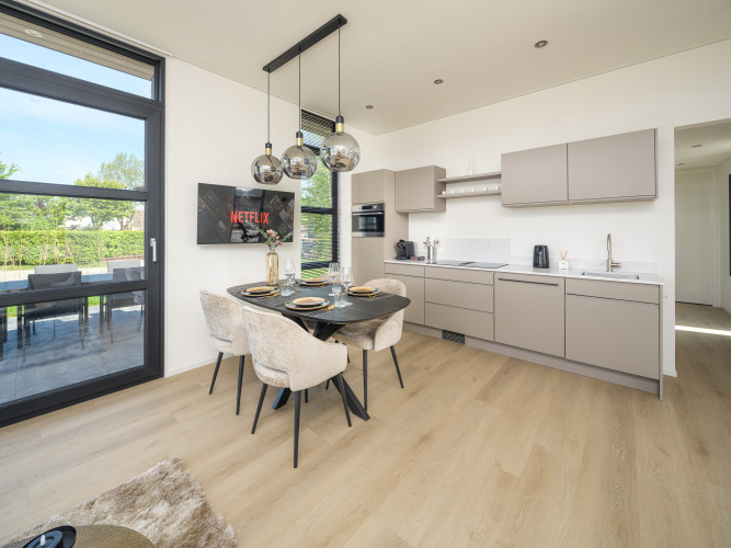 Dankzij de hoge ramen voelt de woning van 70 m² heerlijk ruim en licht aan. De sfeervolle woonkamer heeft een fijne zithoek met TV, een grote eettafel en een moderne open keuken met combi-oven, vaatwasser en inductiekookplaat met geïntegreerde afzuiging.