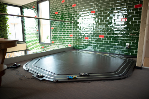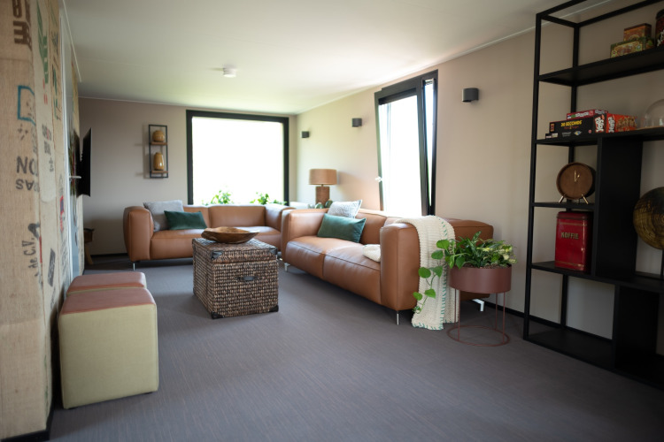 Het echte hart van Coffee Camp is de gezamenlijke Coffee Lounge. Deze ruimte is geïnspireerd op Amsterdamse cafés, met verschillende gezellige zithoekjes, een grote eethoek en een volledig uitgeruste keuken met dubbele apparatuur – ideaal om samen te koken of om lange, relaxte diners te houden. Boven kun je ontspannen met een boek, tv kijken of het gedetailleerde model van Circuit Zandvoort bewonderen – een leuke extra voor F1-fans.
