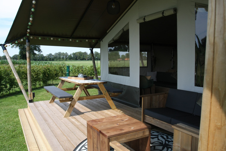 De safaritent is een luxe safaritent geschikt voor maximaal 6 personen, een ideale accommodatie voor een vakantie met het gezin of een groep! Met een oppervlakte van 40m2. Eet met z’n allen aan de grote tafel met stoelen, gooi de voorkant van de tent helemaal open en geniet extra van het uitzicht en de frisse lucht. Maak maaltijden klaar in de complete keuken en kom aan het einde van de dag tot rust op een van de luxe stoelen of in een van de 2 slaapkamers. In de ene slaapkamer vind je een groot tweepersoonsbed, en in de andere kamer staan 2 stapelbedden. Met een lengte van 2 meter zijn de bedden geschikt voor zowel kinderen als volwassenen.
