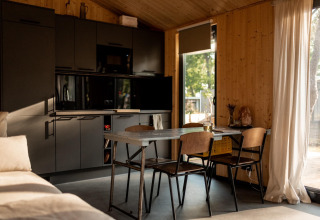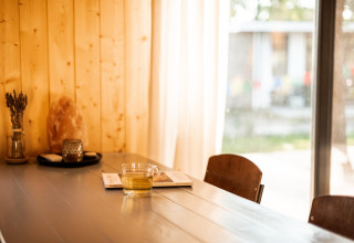 Binnen vind je een warme en uitnodigende woon- en eetruimte waar je heerlijk kunt ontspannen na een dag buiten. Zak weg op de comfortabele bank met een goed boek of geniet van een lange maaltijd aan de eettafel. De goed uitgeruste keuken maakt koken makkelijk, met een elektrische kookplaat, koffiezetapparaat, combimagnetron, vaatwasser en een koel-vriescombinatie – ideaal voor een simpel ontbijt of een uitgebreid diner.