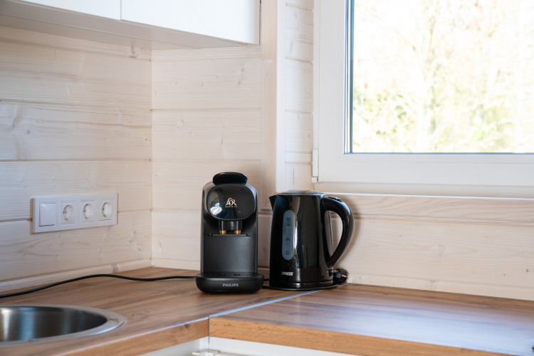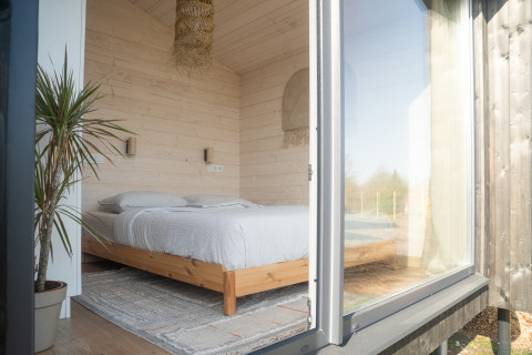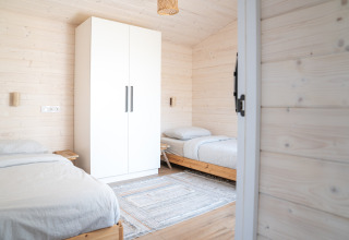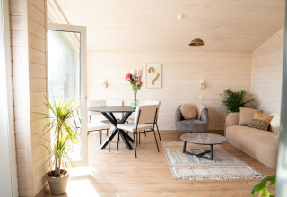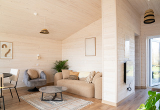 De lodge is geschikt voor 1 tot 4 personen en combineert comfort met een minimalistisch, warm interieur. Grote raampartijen halen het buitenleven naar binnen en zorgen voor een open, lichte sfeer. In de gezellige woonkamer vind je een knusse zithoek en eethoek met uitzicht op het groen. De moderne keuken is volledig uitgerust, zodat je zelf een heerlijke maaltijd kunt bereiden. Er zijn twee slaapkamers: een master bedroom met een tweepersoonsbed en een tweede slaapkamer met een stapelbed. Perfect voor gezinnen, vrienden of koppels die van ruimte houden.