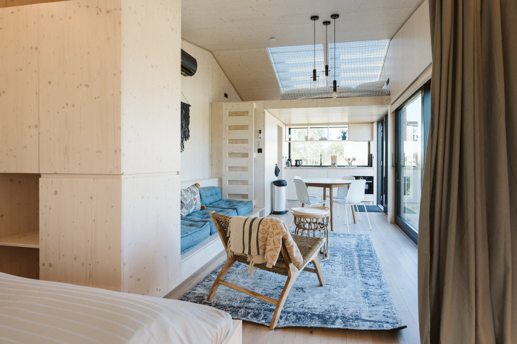 Een écht tiny house-beleving ervaren? Kies voor Backer, dat geschikt is voor 2 tot 4 personen (gezin). De sfeervolle woonkamer biedt, door de grote schuifpui, een mooi panorama op buiten. De grote loungebank is een echte blikvanger in de vakantiewoning. Hier kun je heerlijke uurtjes op doorbrengen, met een goed boek en een lekker glas wijn. De (ouder)slaapkamer is ruim van opzet en via een gordijn eenvoudig af te sluiten van het woongedeelte. De slaapvide bereik je via een steile trap. In combinatie met de inrichting is de slaapvide niet geschikt voor kinderen onder de vijf jaar. De vakantiewoning is uitgerust met een luchtkoeler én beschikt verder over een kleine badkamer met toilet, wasbak en regendouche.