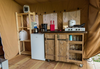Dompel jezelf onder in de natuur zonder aan comfort in te leveren in onze Safari Tenten. Gelegen op stevige houten platforms bieden deze tenten een unieke slaapervaring, hoog boven de grond. Het hart van de tent bevat een veelzijdige keukenunit op wielen, compleet met een vierpitsfornuis, koelkast en Italiaanse moka pot — alles wat je nodig hebt voor een heerlijk ontbijt.