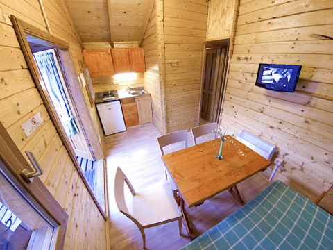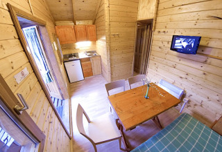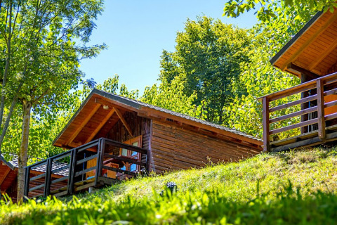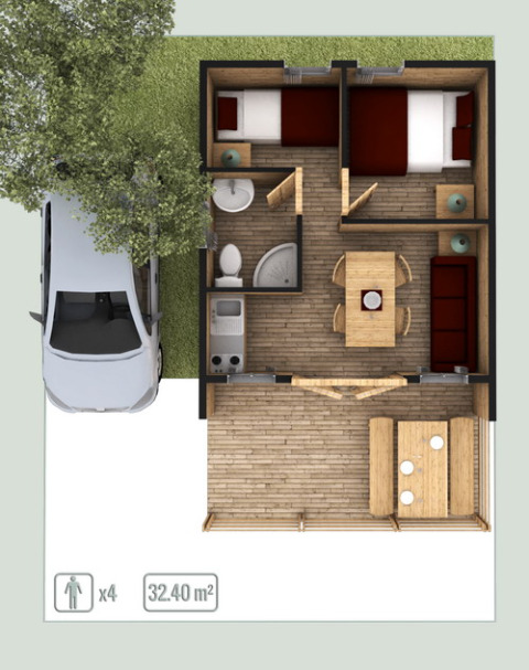 Bungalows van 32,40 m², met 2 slaapkamers en geschikt voor 4 personen. Gelegen in het verhoogde gedeelte van deze camping.