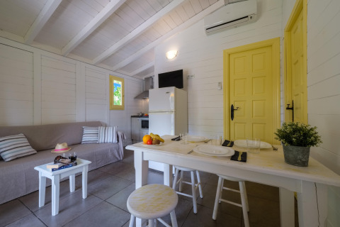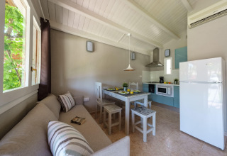 De lichte eethoek is het hart van de bungalow: een fijne plek om samen te eten, een spelletje te spelen of plannen te maken voor de volgende dag. Schuif de deur open en stap je privéterras op, waar je de dag rustig kunt beginnen met een kopje koffie of juist afsluiten met een drankje terwijl de zon ondergaat. Het is je eigen kleine buitenwoonkamer.