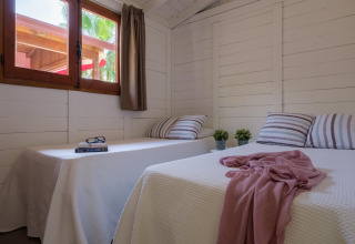 Binnen vind je twee comfortabele slaapkamers, elk met twee eenpersoonsbedden – ideaal voor gezinnen met kinderen of een groep vrienden die samen reizen. Er is een complete badkamer en een praktische, goed uitgeruste keuken waar je ontbijt, snacks voor op het strand, of een simpele avondmaaltijd kunt bereiden na een lange dag in de zon.