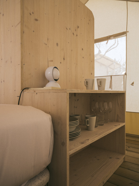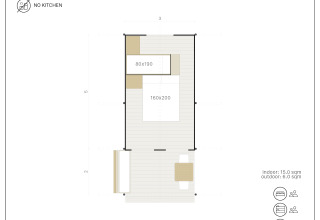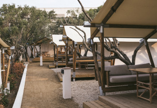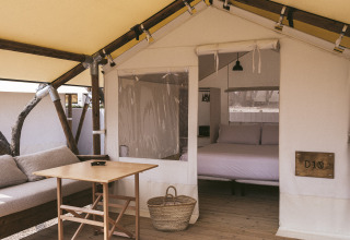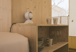 Hoewel er geen eigen keuken of badkamer aanwezig is, liggen de openbare sanitaire voorzieningen op slechts enkele meters afstand. Buiten vind je een gezellig privéterras (6 m²) met tuinmeubilair – ideaal voor een ontbijt in de zon of een spelletje met de kinderen. Eén huisdier is toegestaan, zodat ook je viervoeter mee kan genieten van de vakantie.