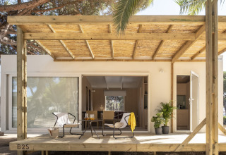 De Mobil Home Family Wood is ontworpen voor gezinnen en vriendengroepen en combineert comfort en stijl in een gezellige setting. Geschikt voor maximaal 4 personen, beschikt het over twee slaapkamers (één tweepersoonskamer en één met twee eenpersoonsbedden), een volledig uitgeruste keuken en een complete badkamer. Het terras met gemeubileerde veranda is perfect om in de schaduw te ontspannen. Honden zijn welkom (optioneel tegen extra kosten).