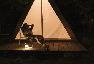 Wel heeft deze tent een mosquito net en een koelkast en op het prive terras staat een loungeset om van de ochtendzon en sterrenhemel te genieten.