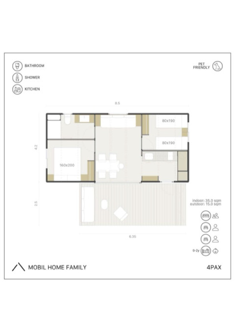 De Mobil Home Family is de perfecte keuze voor je vakantie met het gezin of een groep vrienden, zorgvuldig ontworpen voor maximaal 4 personen. Deze moderne stacaravan bied een gedetailleerd en ruim interieur voor jouw comfort.