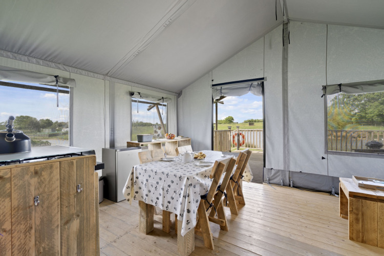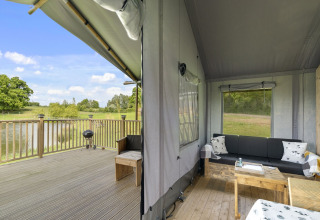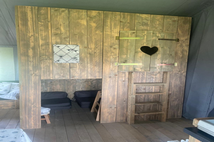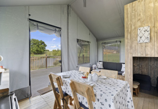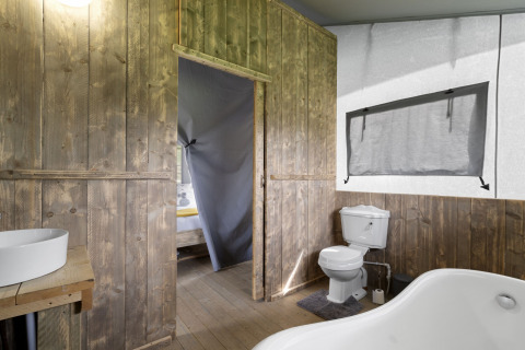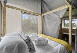 De ruime safaritent biedt plaats aan maximaal 6 gasten, met twee comfortabele tweepersoonsbedden (waarvan één verhoogd voor dat gave boomhutgevoel) en twee enkele slaapfauteuils die ideaal zijn voor kinderen of extra vrienden. Er is een stijlvolle badkuip met rolrand en een volledig uitgeruste badkamer, zodat je kunt genieten van een warm bad na een dag in de buitenlucht.