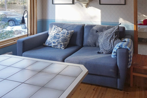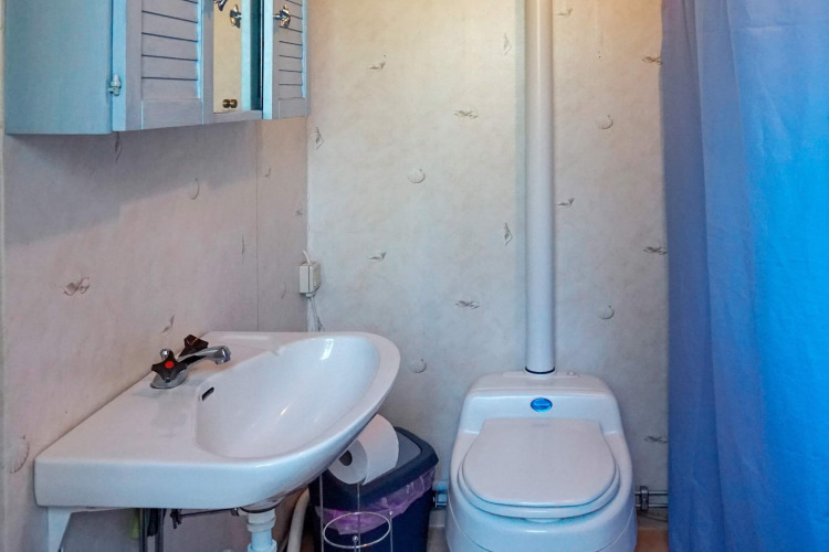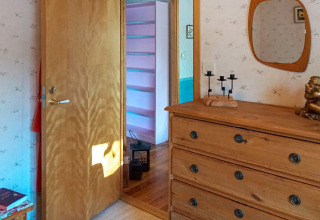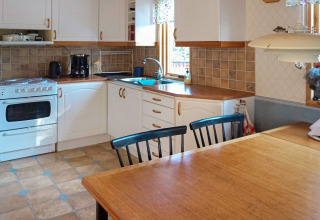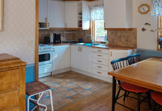 De woonkamer en keuken zijn gecombineerd in één open ruimte, waardoor koken, eten en samen zijn natuurlijk in elkaar overlopen. Er is een eetgedeelte voor ontspannen maaltijden, en op koelere avonden kun je de kachel aansteken voor dat extra knusse Scandinavische gevoel.