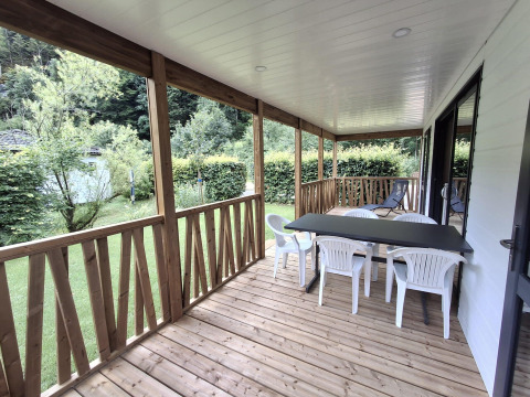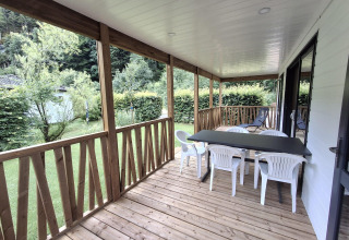 Buiten geniet je van een ruim terras en een groene tuin met tuinmeubilair en een houtgestookte buitenhaard. De lodge ligt niet direct aan de rivier, maar aan een rustig stromend beekje, wat zorgt voor een ontspannen en sfeervolle setting midden in de natuur.